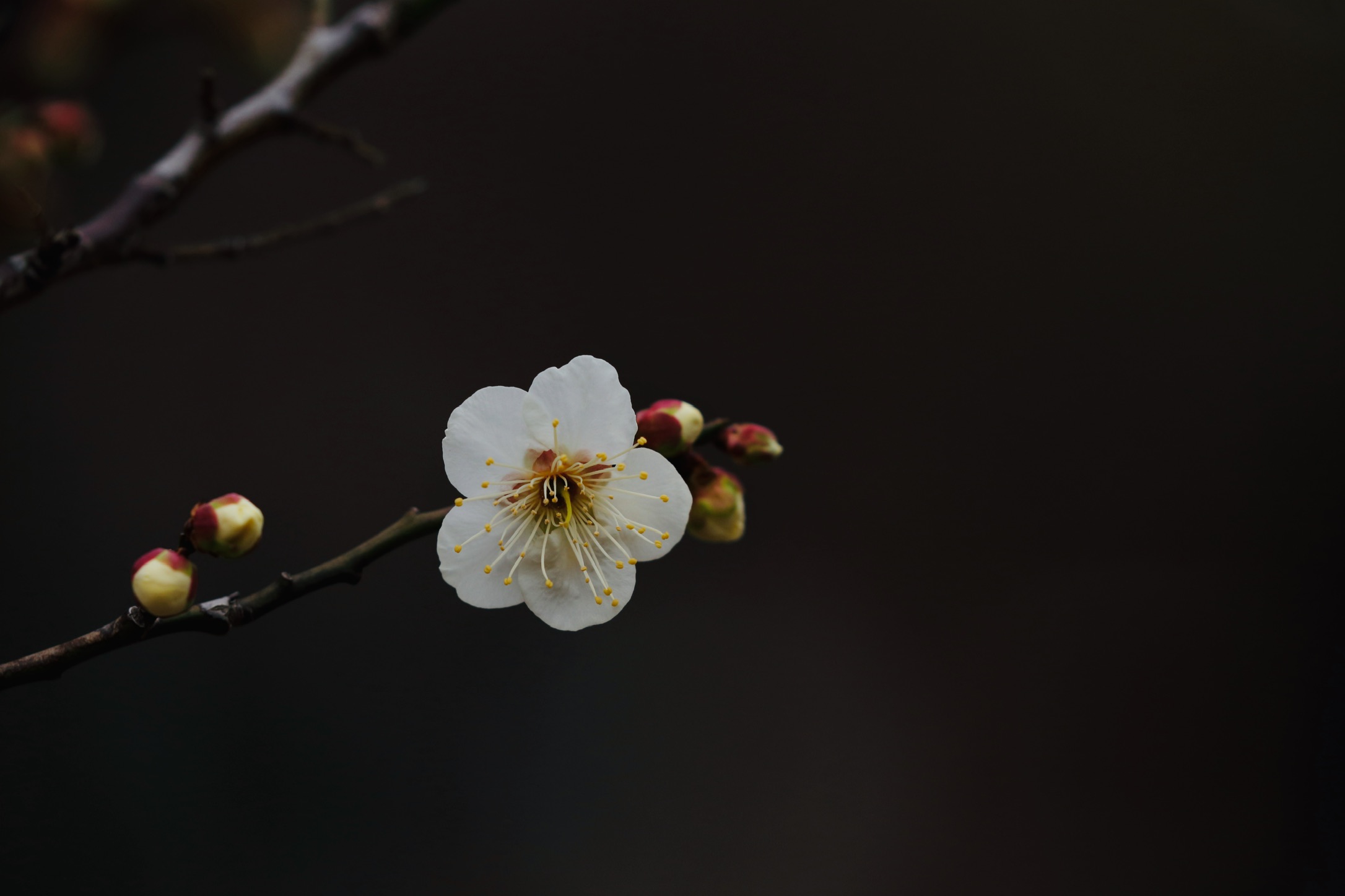 9時過ぎはまだ曇で背景の明るさが落ちていたので芭蕉の句に触発されて月の光に梅が照らされているイメージで撮影してみました。
